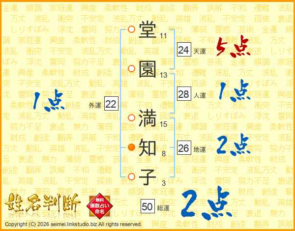 堂(11画)園(13画) 満(15画)知(8画)子(3画)