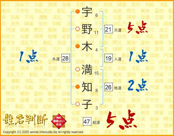 宇(6画)野(11画)木(4画) 満(15画)知(8画)子(3画)