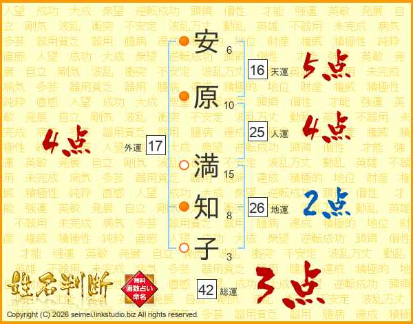 安(6画)原(10画) 満(15画)知(8画)子(3画)