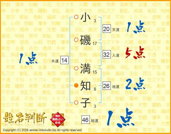 小(3画)磯(17画) 満(15画)知(8画)子(3画)