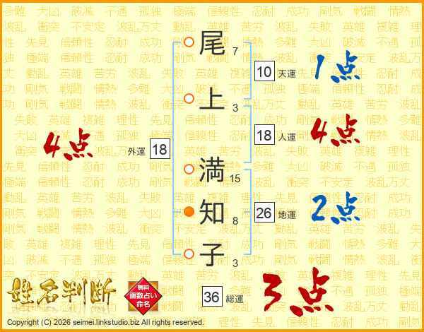 尾(7画)上(3画) 満(15画)知(8画)子(3画)