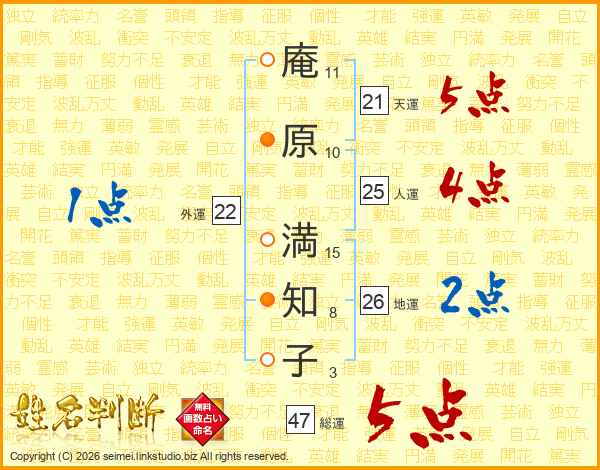 庵(11画)原(10画) 満(15画)知(8画)子(3画)