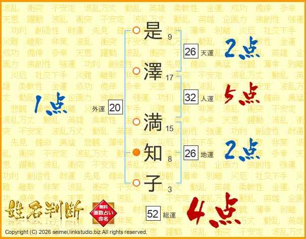 是(9画)澤(17画) 満(15画)知(8画)子(3画)