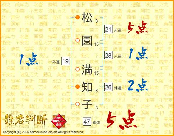 松(8画)園(13画) 満(15画)知(8画)子(3画)