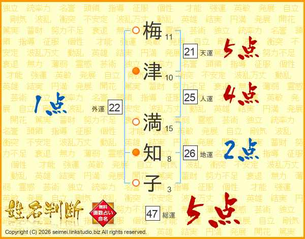 梅(11画)津(10画) 満(15画)知(8画)子(3画)