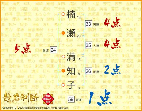 楠(13画)瀬(20画) 満(15画)知(8画)子(3画)