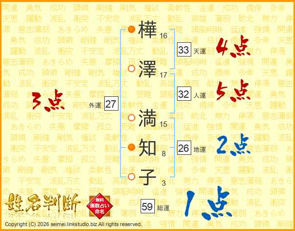 樺(16画)澤(17画) 満(15画)知(8画)子(3画)
