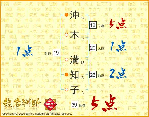 沖(8画)本(5画) 満(15画)知(8画)子(3画)