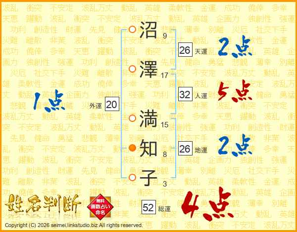 沼澤満知子さんの総運は52画の4点!