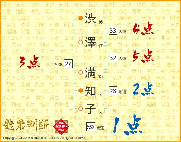 渋(16画)澤(17画) 満(15画)知(8画)子(3画)