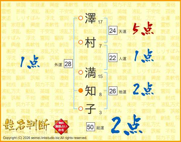 澤(17画)村(7画) 満(15画)知(8画)子(3画)