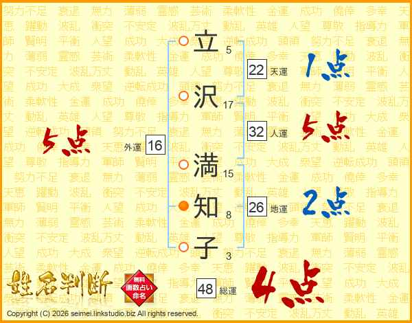 立(5画)沢(17画) 満(15画)知(8画)子(3画)