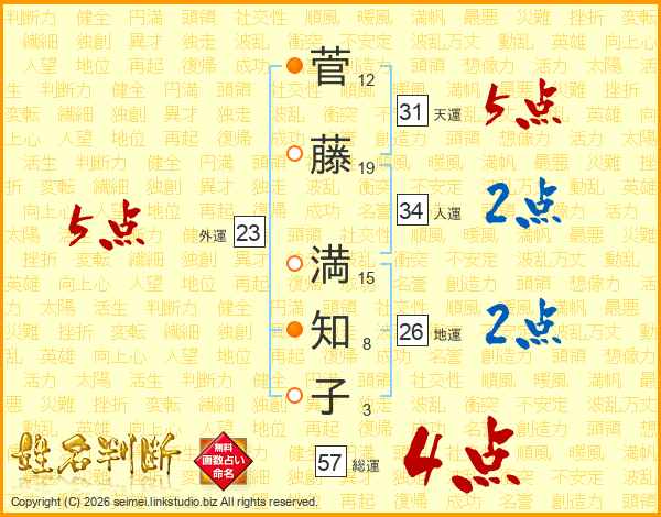 菅(12画)藤(19画) 満(15画)知(8画)子(3画)