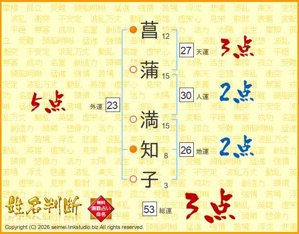 菖(12画)蒲(15画) 満(15画)知(8画)子(3画)