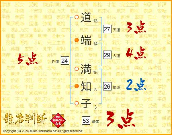 道(13画)端(14画) 満(15画)知(8画)子(3画)