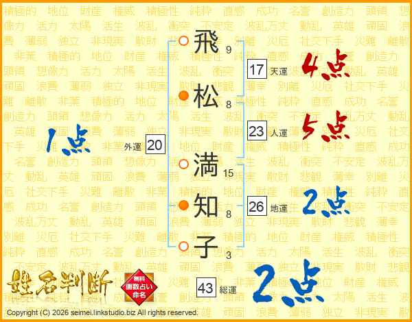 飛(9画)松(8画) 満(15画)知(8画)子(3画)