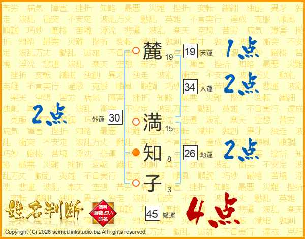 あなたの人生を表す1番重要な運勢です。生涯を通じて影響する総合運となり、主に50歳以降の晩年期に影響を及ぼします。苗字と名前の合計画数。