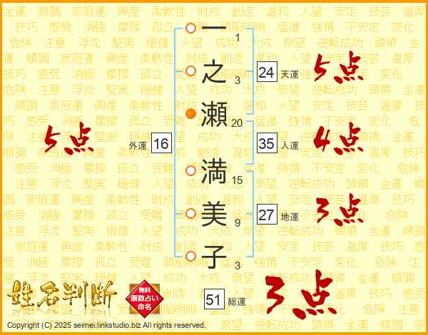 一之瀬満美子さんの外運は16画の5点!