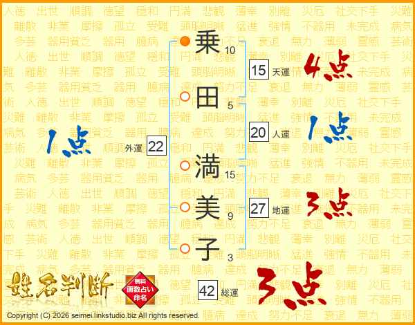 乗(10画)田(5画) 満(15画)美(9画)子(3画)