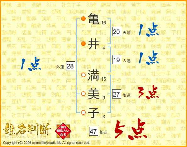 亀(16画)井(4画) 満(15画)美(9画)子(3画)