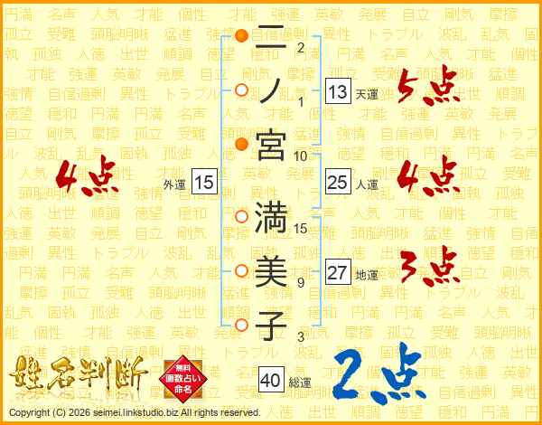 二(2画)ノ(1画)宮(10画) 満(15画)美(9画)子(3画)