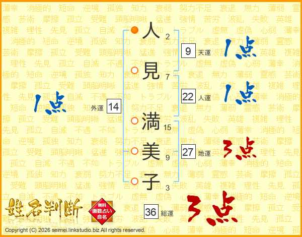人(2画)見(7画) 満(15画)美(9画)子(3画)