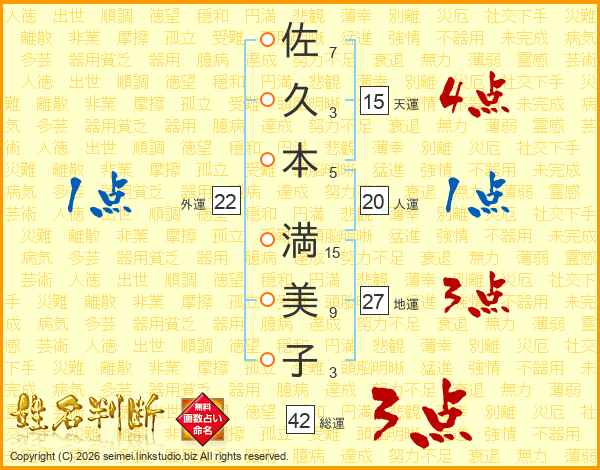 佐(7画)久(3画)本(5画) 満(15画)美(9画)子(3画)