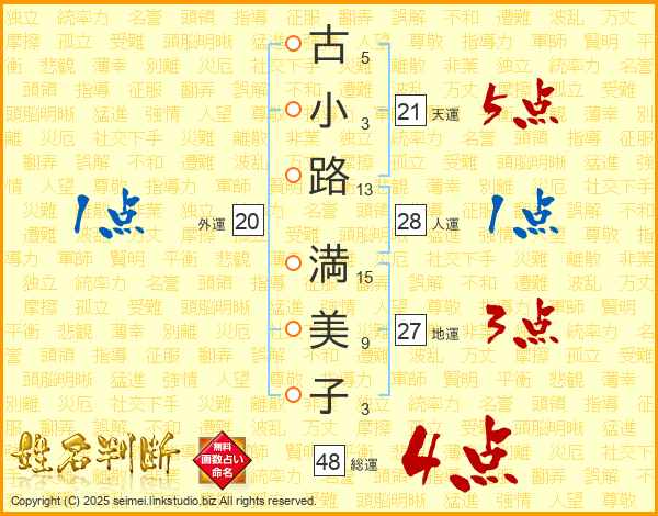 古(5画)小(3画)路(13画) 満(15画)美(9画)子(3画)