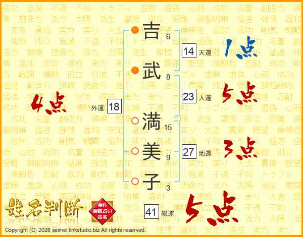 吉(6画)武(8画) 満(15画)美(9画)子(3画)