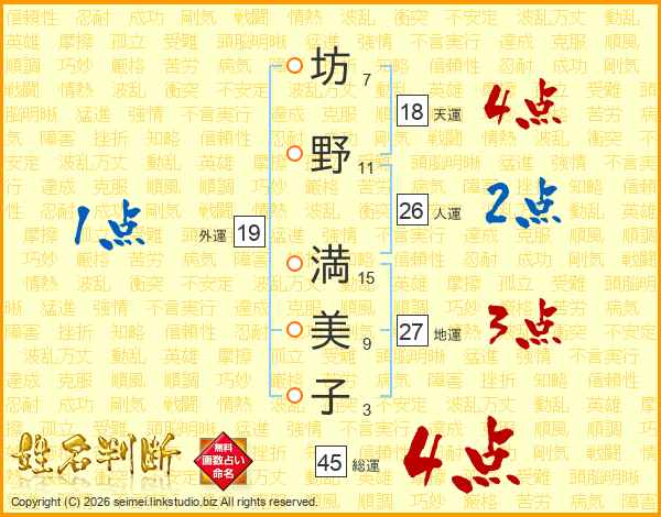 坊(7画)野(11画) 満(15画)美(9画)子(3画)
