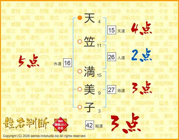 天(4画)笠(11画) 満(15画)美(9画)子(3画)
