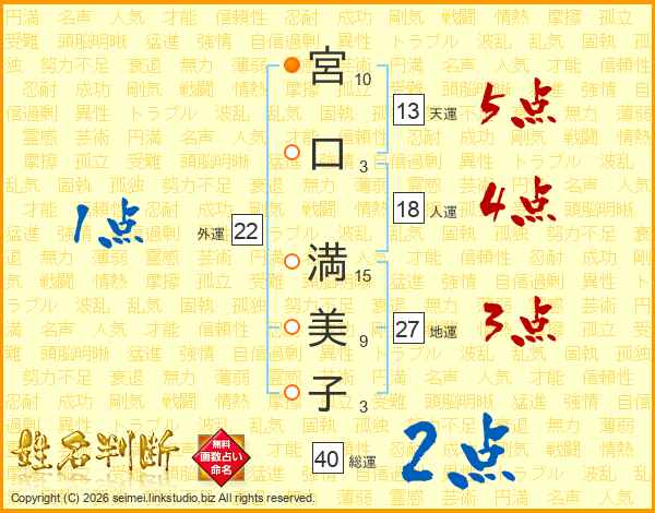宮(10画)口(3画) 満(15画)美(9画)子(3画)