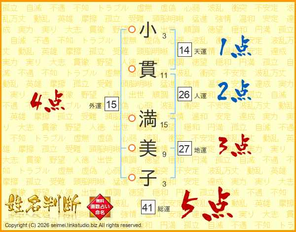 小(3画)貫(11画) 満(15画)美(9画)子(3画)