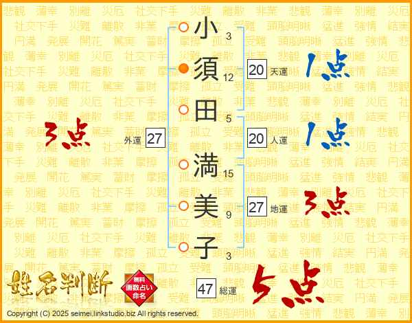 小(3画)須(12画)田(5画) 満(15画)美(9画)子(3画)