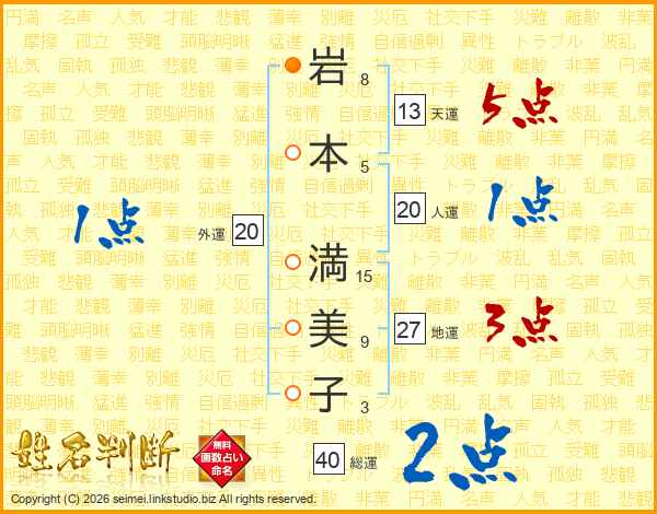 岩(8画)本(5画) 満(15画)美(9画)子(3画)
