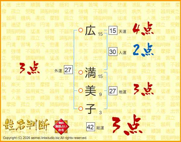生活面を象徴する運勢です。外部から受ける影響力を表し、結婚運、家庭運や職場、環境への順応性を表します。総運から人運を引いた画数。姓や名が1文字の場合を除く。