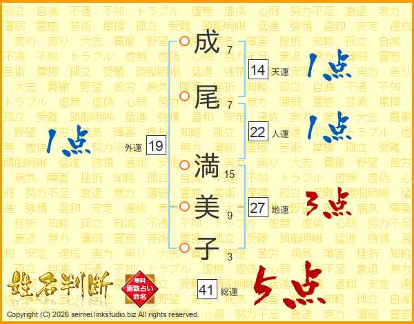 成(7画)尾(7画) 満(15画)美(9画)子(3画)