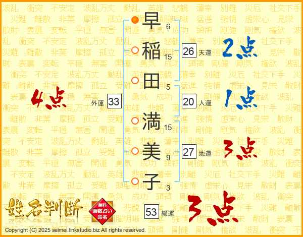 早(6画)稲(15画)田(5画) 満(15画)美(9画)子(3画)