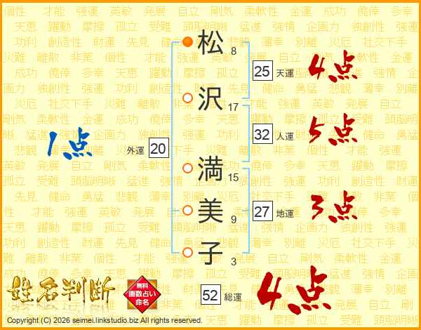 松(8画)沢(17画) 満(15画)美(9画)子(3画)