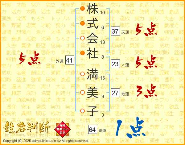 株(10画)式(6画)会(13画)社(8画) 満(15画)美(9画)子(3画)