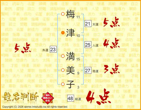 梅(11画)津(10画) 満(15画)美(9画)子(3画)