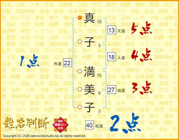 真(10画)子(3画) 満(15画)美(9画)子(3画)