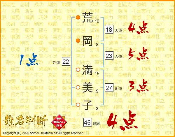 荒(10画)岡(8画) 満(15画)美(9画)子(3画)