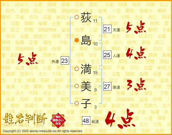 荻(11画)島(10画) 満(15画)美(9画)子(3画)