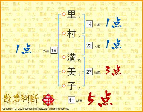 里(7画)村(7画) 満(15画)美(9画)子(3画)