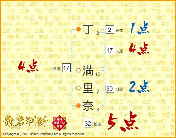 丁(2画) 満(15画)里(7画)奈(8画)