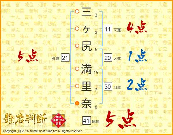 三(3画)ヶ(3画)尻(5画) 満(15画)里(7画)奈(8画)