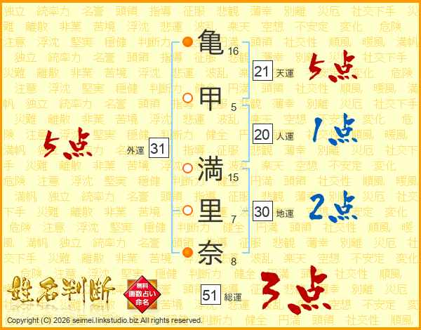 亀(16画)甲(5画) 満(15画)里(7画)奈(8画)