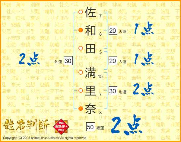 佐(7画)和(8画)田(5画) 満(15画)里(7画)奈(8画)