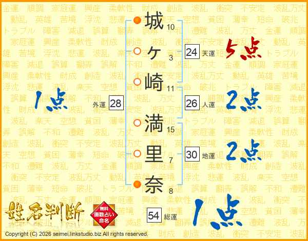 城(10画)ヶ(3画)崎(11画) 満(15画)里(7画)奈(8画)